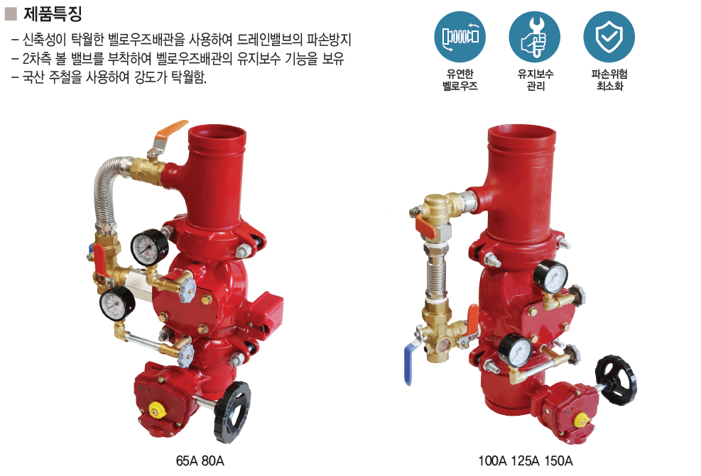 - 신축성이 탁월한 벨로우즈배관을 사용하여 드레인밸브의 파손방지